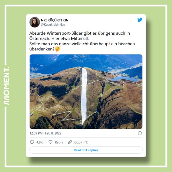 Doch auch bei uns ist Skisport schonmal weit entfernt von echtem Winterzauber. In Mittersill in Salzburg wurde im Oktober 2019 Schnee aus dem vergangenen Jahr konserviert und als weißes Pistenband auf den Berg aufgetragen. "Weißes Elend" wurde es getauft. Auch das ist ein absurdes Wintersport-Bild, wie Twitter-Userin Naz Küçüktekin anmerkt.