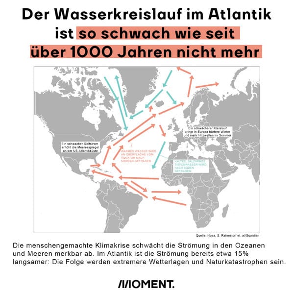 Die weitere Verlangsamung wäre gefährlich nahe an einem Klimakipppunkt, der nicht mehr rückgängig zu machen wäre. Die Folgen wären katastrophal. Aber schon die Auswirkungen der bisherigen Schwächung sind zu spüren. Im nördlichen Teil des Ozeans steigen einerseits an der US-Küste die Meeresspiegel. Und in Europa wird es zu extremeren Wetterlagen kommen. Es klingt vielleicht seltsam, aber die Erderhitzung führt damit in Europa unter anderem zu härteren Wintern - aber auch zu heftigeren Hitzewellen.