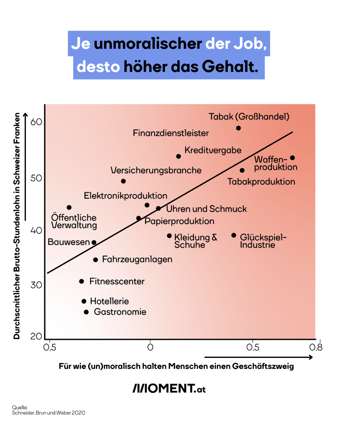 Oft arbeiten Menschen mit niedrigen moralischen Ansprüchen in den unmoralischen Berufen und Branchen. Je unmoralischer ein Beruf wirkt, desto stärker trifft dieser Effekt zu. Es geht rein um Profit, nicht um mögliche Schäden für andere. Oft ist deswegen mehr Geld vorhanden.
