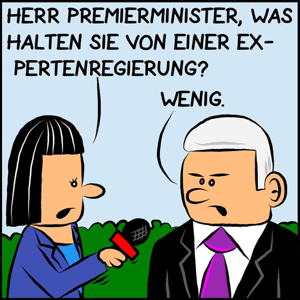 Der Premierminister spricht sich in der neuen Folge des Hebel der Macht-Comic klar gegen eine Expertenregierung aus. Denn in der Politik zählen für ihn Qualitäten, die diese Art der Regierung nicht hat.