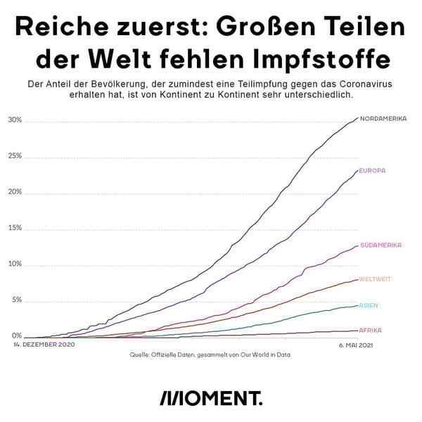Nach dem Umdenken der USA stehen EU und Großbritannien mit ihrem Beharren auf den Impf-Patenten ihrer Pharma-Konzerne ziemlich allein da. Das Problem, das es zu lösen gilt, wird an dieser Grafik offensichtlich: während die reicheren Gegenden der Welt voll in ihren Impfkampagnen stehen, kommen die ärmeren Teile der Welt einfach noch lange nicht zu günstigen Impfstoffen.