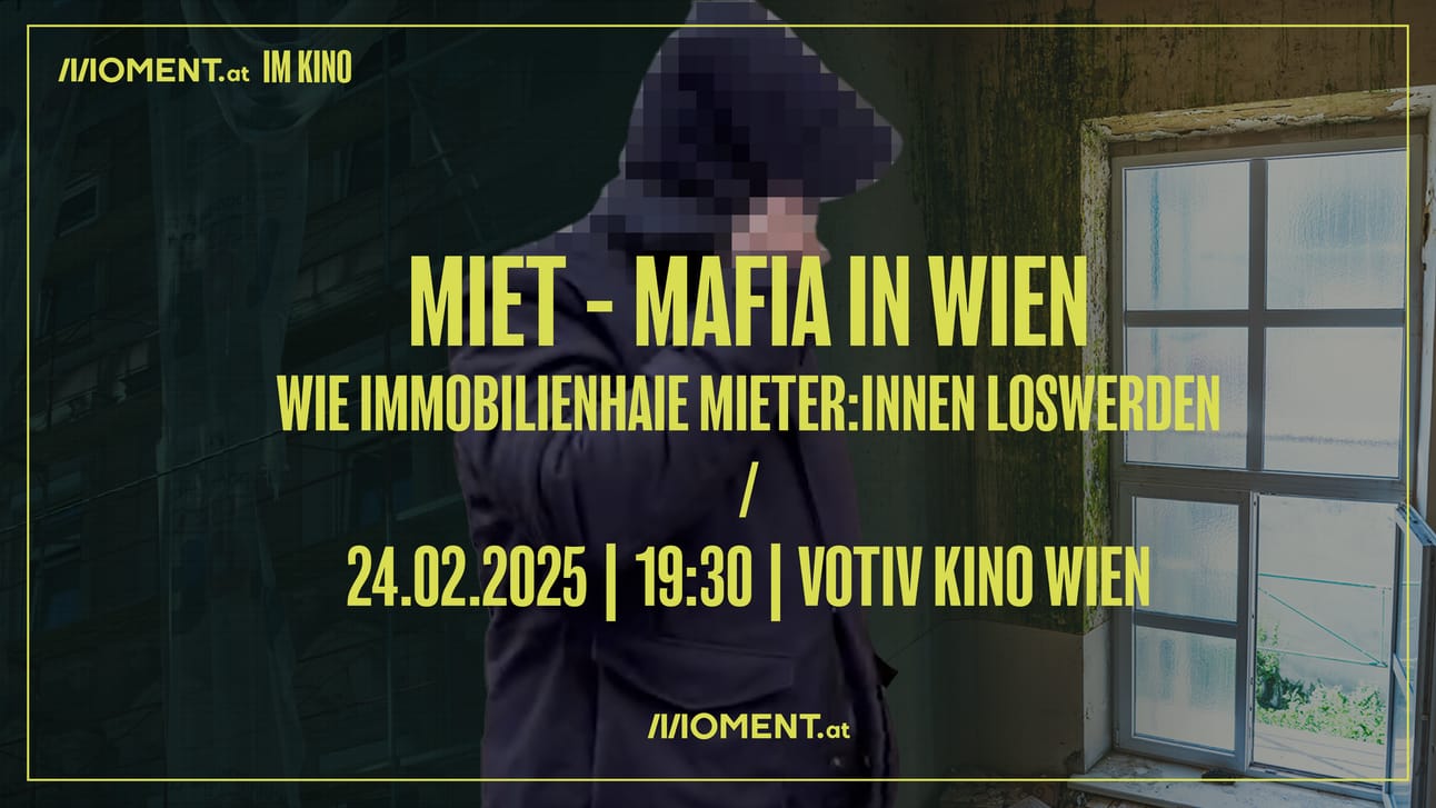 Unsere Doku zeigt die Methoden, mit denen Immo-Firmen in Wien arbeiten. Das Votiv Kino in Wien zeigt den Film auf großer Leinwand: am 24. Februar um 19.30 Uhr. Im Anschluss gibt es ein Gespräch mit den Doku-Macher:innen von MOMENT.at und dem Grünen Wohnbausprecher Georg Prack. Eingeladen dazu hat die Grüne Bildungswerkstatt Wien.