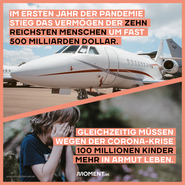 Und die Superreichen? Denen ist es nie besser gegangen. Alleine 2020 konnten sich die zehn reichsten Personen über einen Vermögenszuwachs von 500 Milliarden Dollar freuen. Doch nicht nur sie haben von der Krise profitiert. Ein aktueller Bericht des “World Inequality Lab” zeigt: Der Anteil der Reichen am weltweiten Vermögen ist noch nie so schnell gestiegen wie 2020. Die reichsten zehn Prozent besitzen mittlerweile etwa drei Viertel des globalen Privatvermögens. Die Ungleichheit zwischen Armen und Reichen ist damit so groß, wie zuletzt am Beginn des 20. Jahrhunderts.