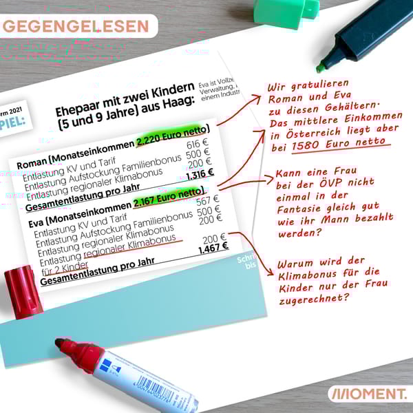 Trotzdem bleibt noch eine weitere kuriose Entdeckung auf der Beispielrechnung der ÖVP. Die Steuerreform bringt laut dieser nämlich Eva sogar mehr als Roman. Möglich wird das aber nur dadurch, dass der Klimabonus für die beiden Kinder aus irgendeinem Grund nur für Eva als Mutter gilt. Roman hat als Vater davon offenbar nichts.