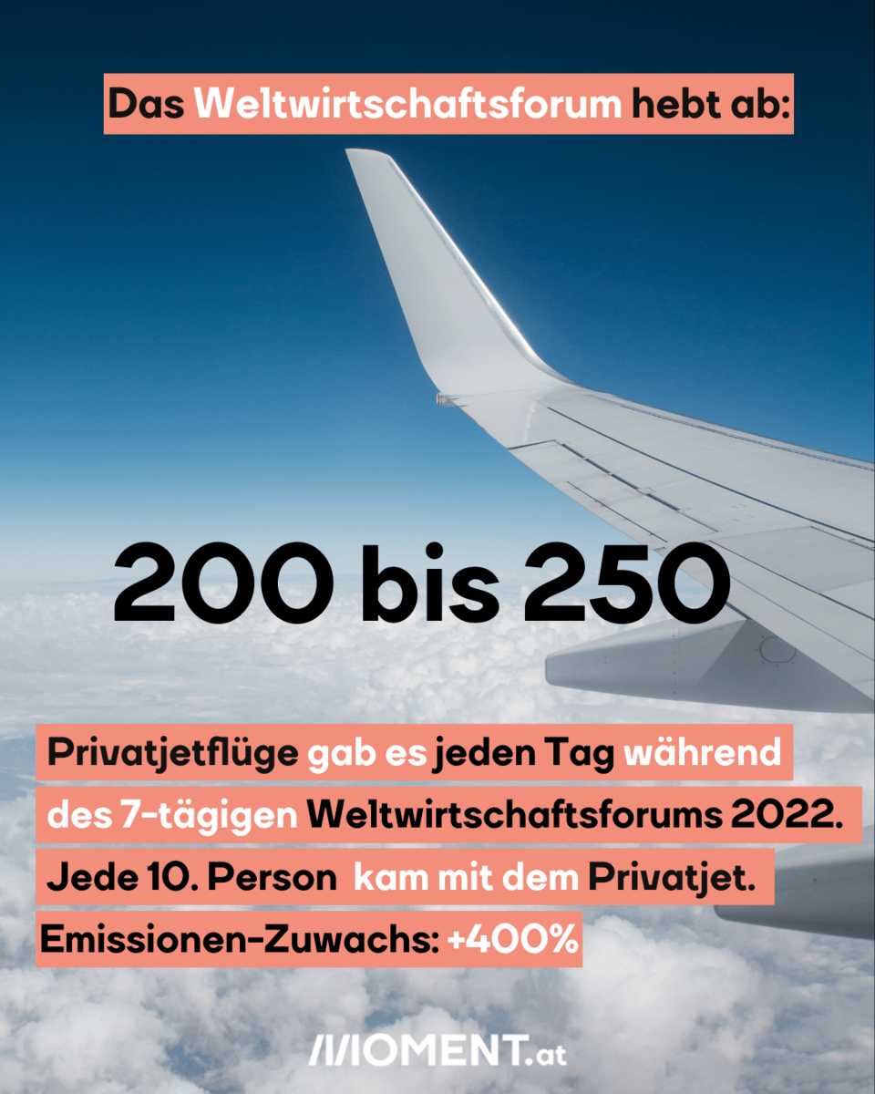 Heute startet das Weltwirtschaftsforum: Die globale Elite trifft sich einmal im Jahr in Davos in der Schweiz, um quasi die Entwicklung der Welt zu bereden – dieses Jahr von 16.-20. Jänner. Die Klimakrise ist eine der größten Herausforderungen unserer Zeit und somit auf der Agenda. Das Problem ist nur, dass viele Spitzenpolitiker:innen, Manager:innen und Expert:innen mit dem Privatjet anreisen. Beim letztjährigen Forum waren das 200 bis 250 Privatjetflüge pro Tag – und das sieben Tage lang. Jede 10. Person kam mit dem Privatjet. Emissionen-Zuwachs in dieser Zeit: +400%. Hinterlässt jedenfalls einen bitteren Nachgeschmack.