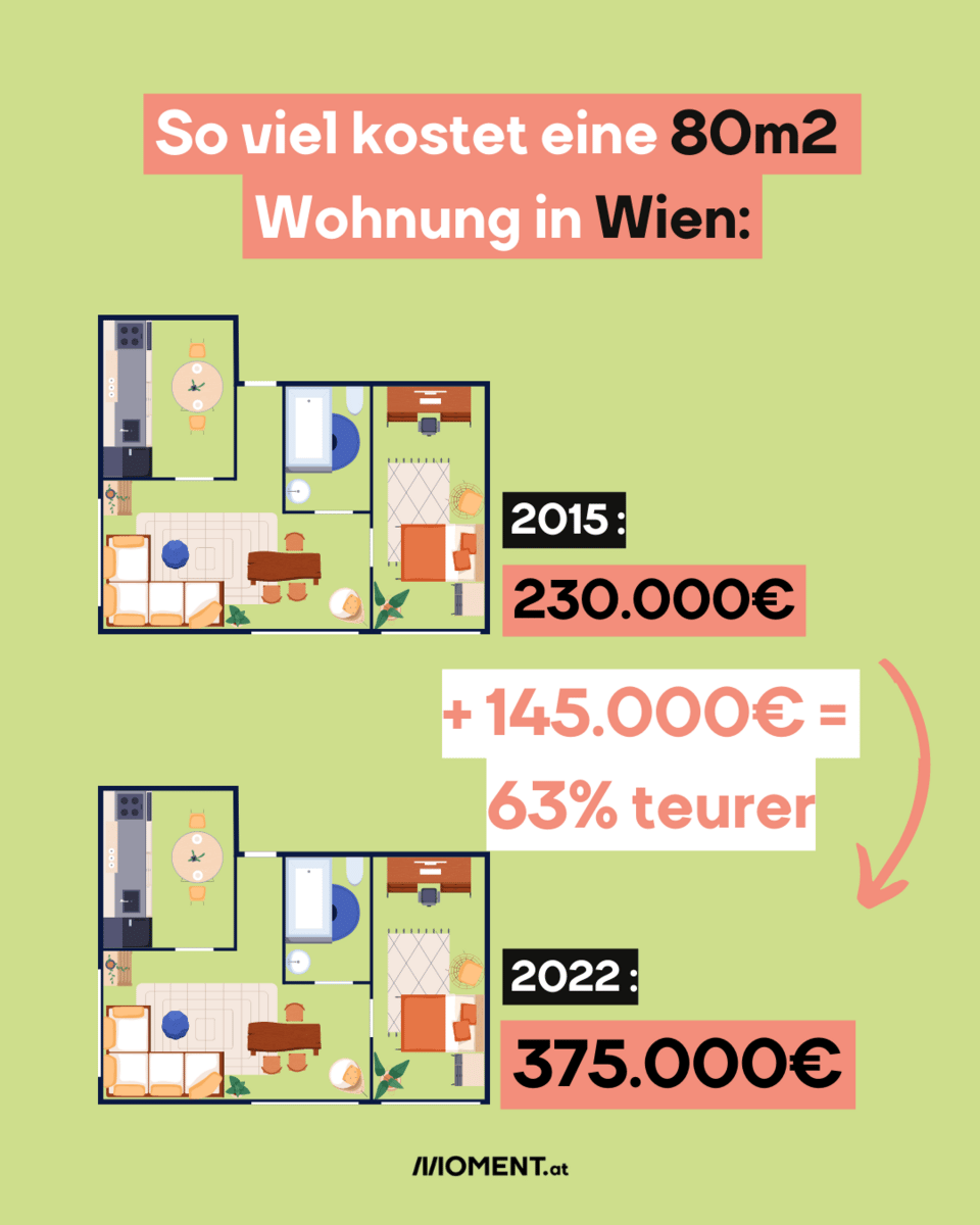 Immobilienpreise sind in den letzten Jahren explodiert – Eigentum ist für viele unleistbarer denn je geworden. Eine 80m² Wohnung in Wien ist in nur 7 Jahren um rund 145.000 Euro teurer geworden - das sind 63% mehr. Und das für weniger Raum. Für die Summe von 2015 bekommt man heute nur noch 50 statt 80m². Wer sich das leisten will, müsste mit einem mittleren Einkommen (ca. 31.400 Euro pro Jahr) rund 68 Jahre sparen.