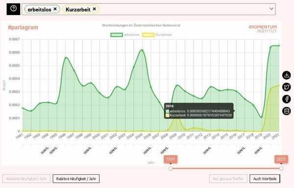 Das Parlagram des Momentum Institut zeigt das historische Ausmaß der Coronakrise: Relativ gesehen sprachen die Abgeordneten nie seit 1949 häufiger über "arbeitslos" und "Kurzarbeit" als im Jahr 2020 und in den ersten Monaten 2021. Wir haben das Tool, über das ihr alle Debatten des Nationalrats nach Begriffen durchsuchen könnt, mit den neuesten Daten gefüttert. Probiert es hier selbst aus.