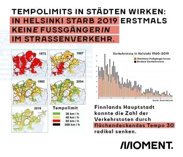 Jetzt wirds positiv: In den 1960er-Jahren hatte Helsinki bis zu über 80 Verkehrstote pro Jahr. Der größte Teil davon waren FußgängerInnen. Seither hat die Stadtverwaltung reagiert und immer wieder die Tempolimits in der Stadt angezogen. Fast nirgends darf man noch über 30 km/h fahren. Und siehe da: Die Zahl aller Verkehrstoten ist stark zurückgegangen. 2019 ist kein einziger Mensch mehr beim Zufußgehen gestorben.