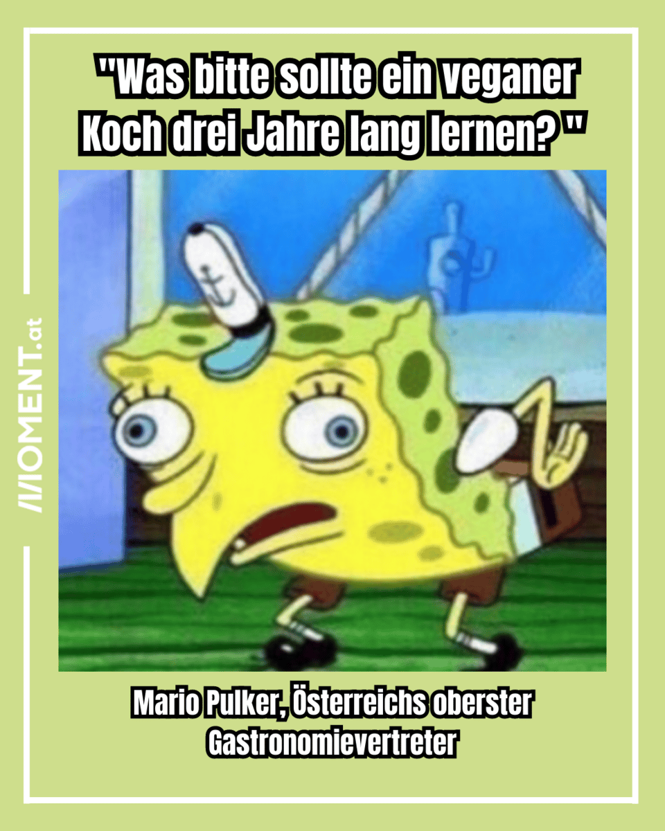 Die Grüne Wirtschaft will eine fleischlose Ausbildung zum Koch etablieren. Aber da hat sie die Rechnung ohne die Wirtschaftskammer gemacht. „Was bitte soll ein veganer Koch drei Jahre lang lernen?“, fragt Mario Pulker, Österreichs oberster Gastronomievertreter. Naja, vielleicht kochen? Und welche Auswirkungen unsere Ernährung auf unsere Gesundheit und die Umwelt hat? Oder, dass die vegetarische Option im Gasthaus nicht immer nur der gebackene Emmentaler sein müsste?
