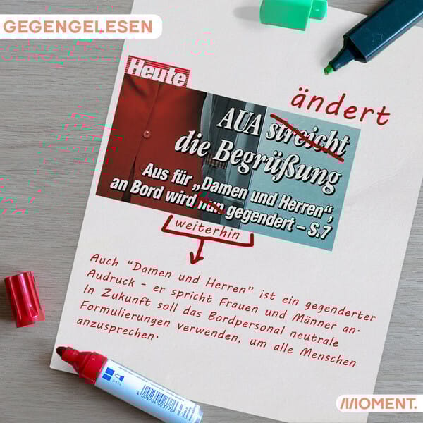 Wie schafft man es auf die Titelseite der Gratiszeitung "Heute"? Offenbar ganz leicht. Die Austrian Airlines änderten eine kleine interne Richtlinie. In Zukunft werden sie ihre Gäste anders begrüßen als bisher. Statt von "Damen und Herren" zu sprechen, sollen an Bord in Zukunft geschlechtsneutrale Formulierungen verwendet werden.