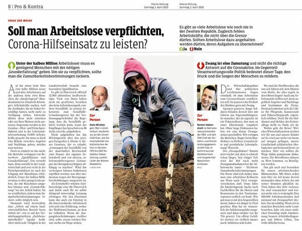 Noch schlimmer kann man diese schreckliche Frage nicht beantworten? Ha! Da legt Winkler noch nach: Man könne doch insbesondere die arbeitslosen Asylberechtigten dazu "verpflichten". Die sind nämlich durch die Rechtslage bei der Sozialhilfe noch viel leichter erpressbar. Klar: In der Zeit, in der diese Menschen auf ihre Asylberechtigung warten, verbieten wir ihnen militant den Zugang zum Arbeitsmarkt und lassen sie von einem kargen Taschengeld in Ungewissheit leben. Aber wenn wir dann endlich behördlich akzeptiert haben, dass diese Leute tatsächlich mit gutem Grund geflohen und schutzbedürftig sind, und wenn auch noch ein tödliches Virus draußen rumfliegt, dann zwingen wir sie dazu. "Einstieg in den Arbeitsmarkt", nennt Winkler das. "Klar! Das drucken wir", sagt die Kleine Zeitung dazu.