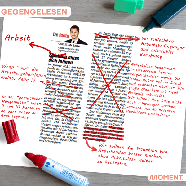 MOMENT arbeitet unabhängig von Parteien, Banken und Konzernen. Damit das möglich ist, brauchen wir die Hilfe möglichst vieler Menschen. Alle Möglichkeiten, uns zu unterstützen, findest du hier. Jeder Euro macht einen Unterschied. Danke!