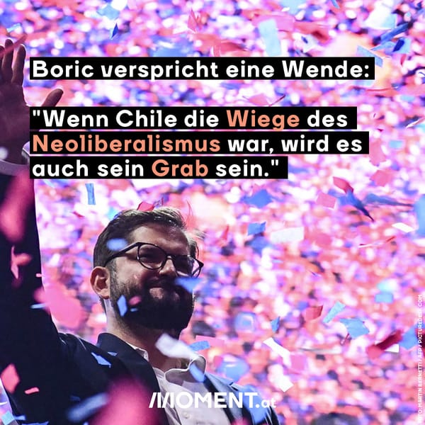 Boric verspricht nun einen Richtungswechsel für das Land mit seinen 19 Millionen Einwohner:innen: "Wenn Chile die Wiege des Neoliberalismus war, wird es auch sein Grab sein." Sein Wahlprogramm wurde unter Beteiligung von 33.000 Menschen im Land entwickelt. Darin hat er 53 Maßnahmen für Chile versprochen. Darunter ein Allgemeines Gesundheitssystem ohne Privilegien für Wohlhabende, die Schaffung eines staatlichen Pensionssystems, der Ausbau des öffentlichen Wohnbaus und Steuern für Überreiche in den 0,01% der Bevölkerung.