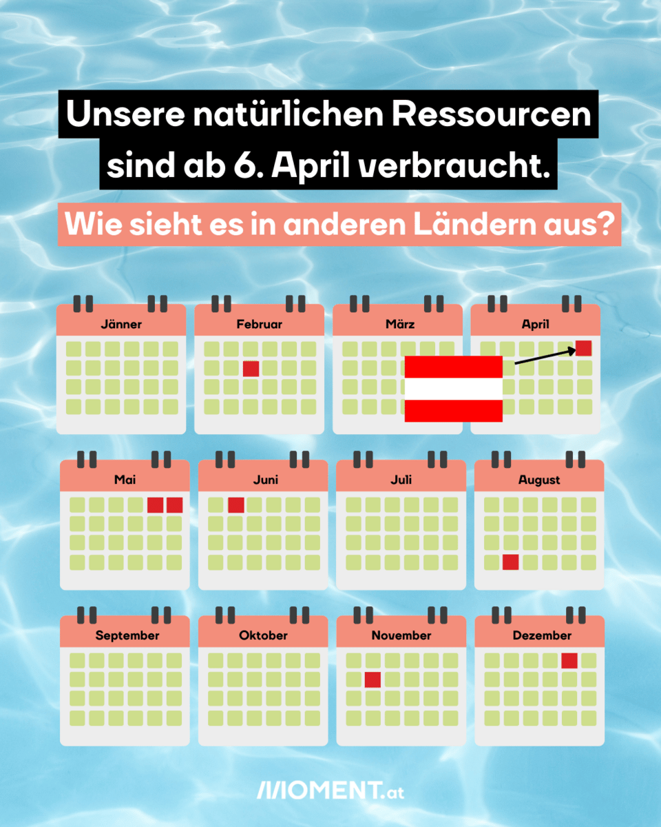 In den ersten drei Monaten des Jahres wurden in Österreich schon alle Ressourcen verbraucht, die natürlich wieder zurückgewonnen werden können. Das sagt uns der Overshoot Day. Dieser wird für jedes Land einzeln berechnet und dient als Warnsignal. Mit dem Overshoot Day am 6. April liegt Österreich im vordersten Bereich und katapultiert sich weltweit auf den 10. Platz. Würden alle Länder gleich viele Ressourcen wie Österreich verbrauchen, bräuchten wir drei Erden.