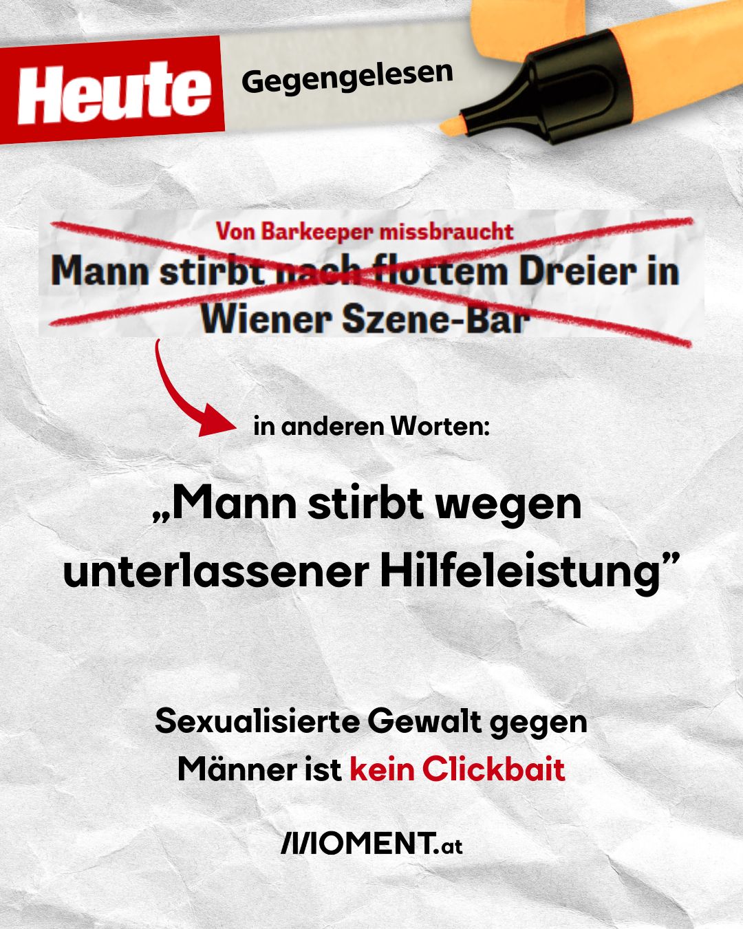 Im Artikel schreibt die Zeitung vom „verruchten” Lokal in dem es „zur Sache gegangen” sei und wo eine „schlüpfrige Party” gefeiert wurde. Der Tod des Mannes hat nichts mit seinem konsensuellen Sexualverhalten zu tun. Das hat auch nichts damit zu tun, dass er sexualisierte Gewalt erfahren hat. Durch das Clickbait und die Verknüpfung verharmlost die "Heute" sexualisierte Gewalt gegen Männer und zieht sie durch die Beschreibungen ins Lächerliche.