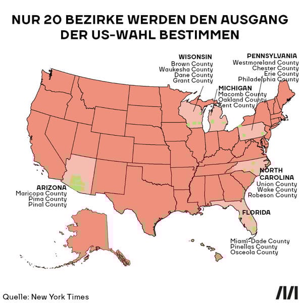 Weil bei Präsidentschaftswahlen in den USA nicht die Zahl der Wählerstimmen entscheidet, sondern grob gesagt die Größe der gewonnenen Bundesstaaten, werden die Wahlen dort entschieden, wo WechselwählerInnen den Unterschied machen. 6 der 50 Bundesstaaten sind deshalb besonders hart umkämpft. Und selbst diese Bundesstaaten werden laut Analyse der New York Times noch dazu in nur wenigen Bezirken entschieden. Nur 20 von über 3.000 Bezirken im ganzen Land können so gesehen den Unterschied machen. Donald Trump bekam wegen dieser Eigenheit des Wahlsystems 2016 zwar insgesamt fast 3 Millionen Stimmen weniger als Hillary Clinton, er hat einige dieser Bezirke aber sehr knapp gewonnen. Joe Biden sollte zumindest diese Bezirke gedreht haben, um demnächst Präsident zu sein.