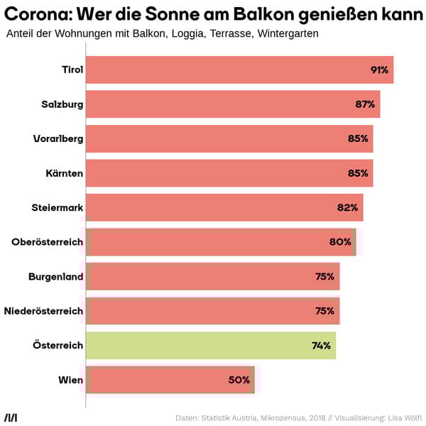 Es ist gut und wichtig für einen klaren Kopf in der Isolation, ab und zu Frischluft zu schnappen und vielleicht etwas Sonne zu tanken. Für manche Menschen ist das aber einfacher als für andere. Wie viele Balkone, Terrassen, Wintergärten oder Loggien den Menschen zur Verfügung stehen, wo sie abgeschottet bleiben und gleichzeitig in der Frischluft sein können, ist nämlich nicht überall gleich. In Städten haben Menschen naturgemäß viel weniger Gelegenheit dazu. In Wien, wo es hauptsächlich dicht besiedelte Gebiete gibt, hat nur jeder zweite Wohnungs-Haushalt so etwas. In ländlichen Gegenden sind es viel mehr. Beim Spitzenreiter Tirol sind 9 von 10 Wohnungen damit ausgestattet.