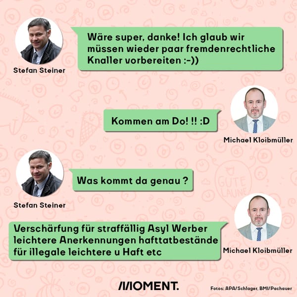 Darin besprechen sich Stefan Steiner und Michael Kloibmüller über "fremdenrechtliche Knaller". Gemeint waren damit öffentlichkeitswirksame Verschärfungen für Asylwerbende. Steiner war einer der engsten Berater von Sebastian Kurz und Sektionschef im Integrationsbereich im Kurz-Ministerium. Kloibmüller war Kabinettschef von Innenminister Wolfgang Sobotka. Sobotka wurde vom späteren Bundeskanzler Christian Kern als "Abrissbirne der Zusammenarbeit" bezeichnet, weil er die Koalition zwischen SPÖ und ÖVP immer wieder spaltete. Derartige Verschärfungen zählten zu den Spaltpilzen.