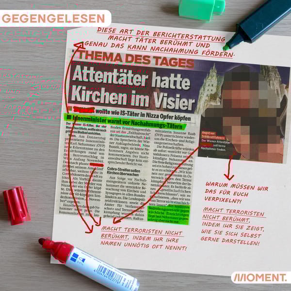 ÖSTERREICH hat es mal wieder in unsere Rubrik "Gegengelesen" geschafft. Ein Bericht, der vor Wiederholungstätern des Terroranschlags in Wien warnt, ist so formuliert, dass er Wiederholungstaten wahrscheinlicher macht. Terroristen sollte man nicht mit ihren selbst verbreiteten Bildern zeigen - schon gar nicht, wenn sie sich per Selfie in Heldenpose plus Waffen darstellen. Und: Der Namen eines Attentäters muss nicht unnötig bekannt gemacht werden. Diese Art von "Ruhm" ist etwas, das Amokläufer und Terroristen manchmal zu ihren Taten bewegen kann. Das ist alles in den vergangenen Wochen diskutiert worden und bekannt. Wann kommt das Basiswissen von journalistischer Ethik auch in der Redaktion von OE24 und ÖSTERREICH an?