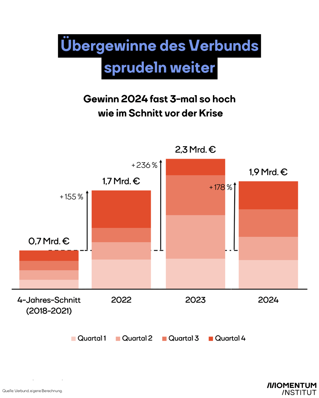 Nur 3,55 Prozent Übergewinnsteuer zahlte die Verbund AG laut Analyse des Momentum Instituts für die 3,8 Milliarden Euro. Das zeigt: Die Übergewinnsteuer ist zahnlos. 90 Prozent des Preises über 120 Euro pro Megawattstunde (MWh) Strom werden abgeschöpft.
