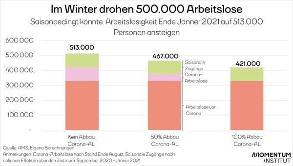 Die Arbeitslosenzahlen sinken. Doch Entwarnung gibt es noch lange nicht: Denn in der kalten Jahreszeit gibt es immer mehr Arbeitslose als im Sommer. Zusätzlich zu diesen saisonalen Arbeitslosen könnten es mit den Corona-Arbeitslosen nächsten Jänner ein trauriges Rekordhoch geben. Das Momentum Institut hat berechnet, dass im Jänner die Arbeitslosenzahlen wieder auf dem Rekordhoch von April liegen und die kritische Marke von über 500.000 erreicht werden könnte. Deshalb braucht es Maßnahmen, um die Corona-Arbeitslosigkeit zu bekämpfen.
