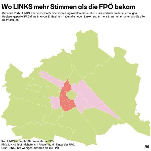 Bei der Wien-Wahl ist die rechte und rassistische FPÖ abgestürzt. Nicht nur das: In 6 von 23 Bezirksvertretungen hat die neue Partei LINKS mehr stimmen als die Freiheitlichen. In einigen anderen war sie nur knapp dahinter. Schön zu sehen, dass menschenfreundliche Politik gegen menschenfeindliche gewinnen kann, sogar wenn sie von einer Kleinstpartei mit wenig Geld kommt.