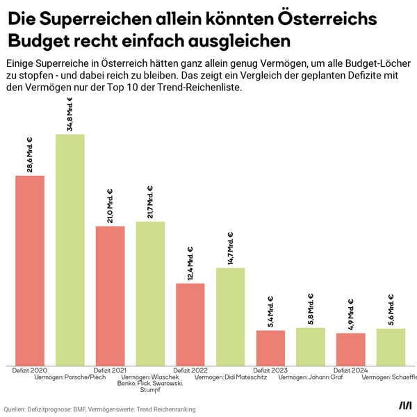 Finanzminister Gernot Blümel (ÖVP) hat für die kommende Jahre große Löcher im Budget eingeplant. Wie man so große Löcher stopfen kann? Eigentlich wäre es ganz einfach, wenn man sich nur mal das Vermögen der 10 reichsten Familien oder Menschen in Österreich ansieht. Dabei müssten die das eh nicht allein stemmen. Insgesamt schätzt das Wirtschaftsmagazin Trend, dass es mindestens 40 Familien mit Milliardenvermögen in Österreich gibt. Dazu kommen noch etwa 160.000 Millionäre, die sicher auch gern ein bisschen mithelfen würden. Im tatsächlichen Budget sind größere Beiträge von Superreichen natürlich leider nicht vorgesehen.