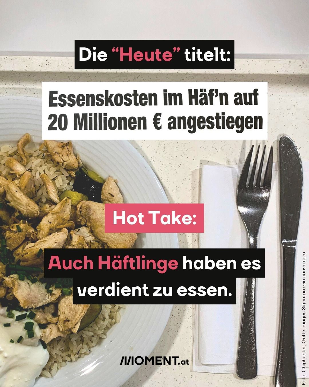 Die FPÖ und das Boulevardblatt Heute stören sich an der Höhe der Essenskosten für Häftlinge. Für den Skandal genügt schon, dass die Essenskosten in Gefängnissen steigen. Ob das mit der hohen Teuerung der vergangenen Jahre zu hat? Wir erfahren es nicht. Denn der Bericht in der "Heute" basiert nur auf eine Initiative der FPÖ. Es wird nichts eingeordnet. Andere Parteien oder Expert:innen kommen nicht zu Wort.