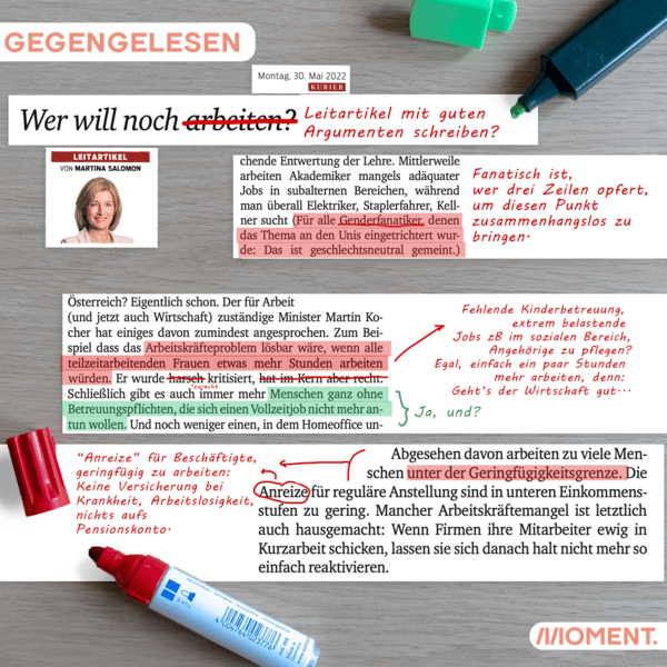 Heutzutage will niemand mehr arbeiten! Die Leier kennen wir schon. Auch im Leitartikel der Kurier-Chefredakteurin Martina Salomon lesen wir, dass Arbeitskräfte "aktiviert" werden müssen. Wie? Kein Problem: Alle sollen einfach ein bisschen mehr arbeiten. Frauen? Menschen in Teilzeit? Sollen alle einfach mehr arbeiten.