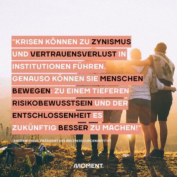 Krisen erschüttern unser Grundvertrauen in Institutionen und Gesellschaften und können uns zynisch machen. Aber sie sind auch Gelegenheiten mutig nach vorne zu schauen und zu sagen: "Machen wir es zukünftig halt einfach besser als bisher". Unser Zitat des Tages von Andrew Steer, dem Präsidenten des Weltressourceninstitutes, lässt sich sicher als Aufruf zum Bessermachen verstehen. Weil vor der Krise war die Welt schon noch ein paar Millimeter weit weg von "perfekt".