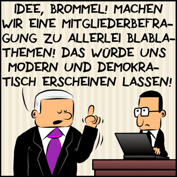 In unserer Comic-Serie "Hebel der Macht" hat Premierminister Oktavian Klenk in dieser Woche eine geniale Idee: Er will die Mitglieder seiner Partei befragen.