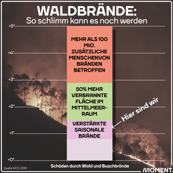 Waldbrände wüten in Europa. Vor allem Italien, Griechenland und die Türkei sind betroffen. Durch die lange Hitzeperiode sind große Gebiete so ausgetrocknet, dass sich das Feuer rasch ausbreitet. Alarmierend: Waldbrände werden bald keine mehr Seltenheit sein. Denn die Klimakrise führt zu immer höheren Temperaturen und Dürreperioden. Die Grafik zeigt: Wenn wir die Erderhitzung nicht stoppen, werden bald mehr als 100 Millionen Menschen zusätzlich von Bränden betroffen sein. In der Online-Version siehst du die Grafik animiert.