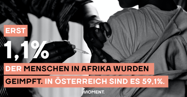 In Afrika wurde im Schnitt erst 1,1 Prozent der Bevölkerung zumindest einmal geimpft. In Ländern mit hohen Einkommen wurden bereits 54,9 Prozent zumindest einmal geimpft. In Österreich sind es bereits 59,1 Prozent.