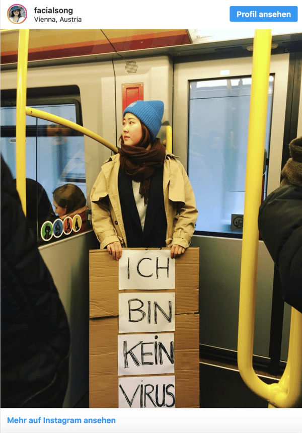 Berichte über den Coronavirus schaffen es nicht mehr auf die Titelseiten. Das Leben von ostasiatisch-stämmigen Menschen in Wien ist aber weiterhin durch angstgetriebenen Rassismus beeinträchtigt. Darauf macht eine Wienerin wieder aufmerksam: Sie fährt mit dem Schild "Ich bin kein Virus" U-Bahn.