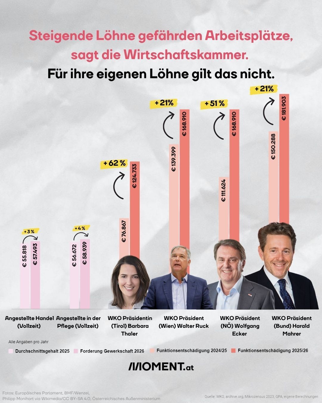 All das ist nichts gegen die Erhöhungen, die sich die Präsident:innen der Landeskammern dieses Jahr gegönnt haben: Ihre „Funktionsentschädigungen” sind im August um bis zu 62 Prozent gestiegen, wie das Ö1-Morgenjournal zuerst berichtet hat. Fast schon bescheiden schaut da WKO-Präsident Harald Mahrer (ÖVP) aus: Seine Bezüge stiegen „nur” um 21 Prozent auf 182.000 Euro im Jahr. Davon lässt sich natürlich kaum leben – ein Glück also, dass er als Präsident der Nationalbank noch 88.000 Euro pro Jahr dazuverdienen kann.