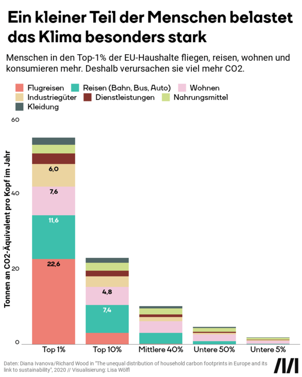 Die reichsten Haushalte der EU tragen viel mehr zur Klimakrise bei. Die Grafik zeigt, dass beispielsweise Essen nur einen kleinen Teil der Emissionen ausmacht. Flugreisen hingegen sind für einen großen Teil des Verbrauchs reicher Haushalte verantwortlich. Mehr zu Verteilungsgerechtigkeit und Klima liest du hier.