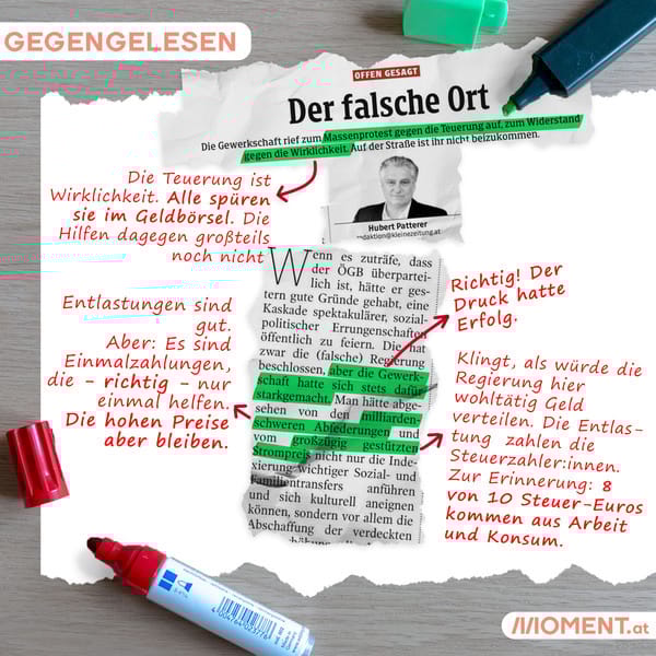 Protest gehört nicht auf die Straße? Das mussten wir gegenlesen. Zehntausende demonstrierten gegen die Teuerung und für höhere Löhne. In der Kleinen Zeitung fordert Chefredakteur Hubert Patterer, von der Teuerung betroffene Menschen sollten besser zu Hause bleiben. Seine Argumente sind fehlerhaft und populistisch. (die gesamte Bildgalerie findest du mit Klick auf das Bild)